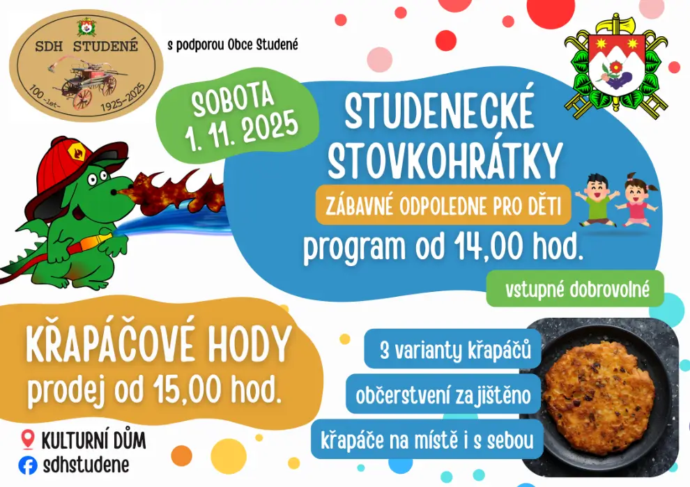 V sobotu 1. 11. 2025 od 14:00 zveme do Kulturního domu ve Studené na Studenecké stovkohrátky – zábavné odpoledne pro děti.