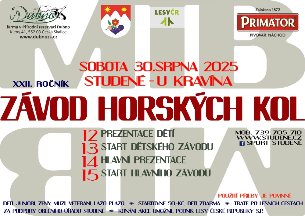Zveme na Závod horských kol, v sobotu 30. srpna 2025 ve Studeném – U kravína. Čeká vás sportovní den plný adrenalinu i zábavy pro celou rodinu.